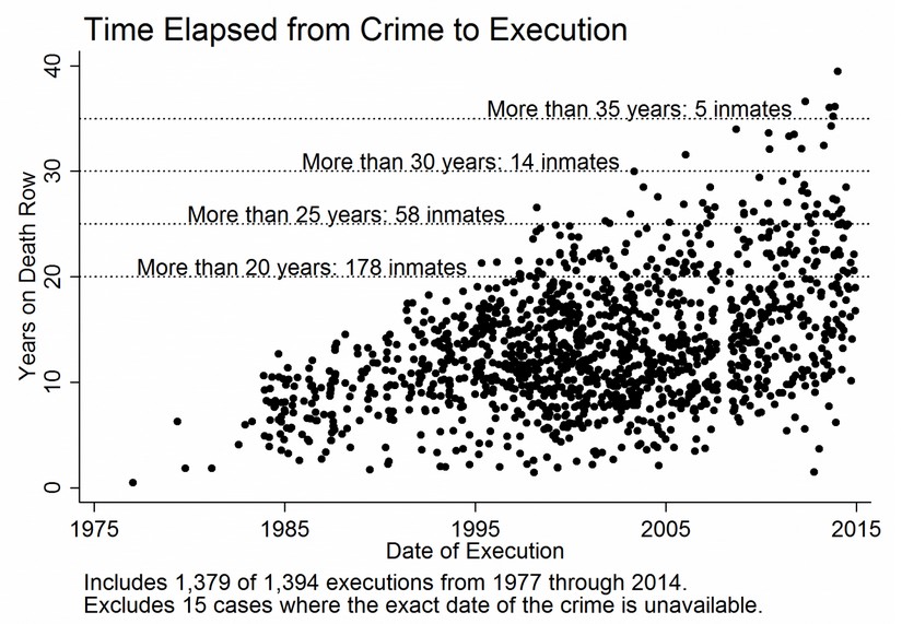 Each dot on the figure refers to a particular inmate executed. At the lower-left corner, the 1st case is the 1st “modern” execution: Gary Gilmore, executed by firing squad in Utah in 1977. Vertical placement of the dot indicates the number of years from the crime to the execution. Horizontal placement indicates the date of the execution.